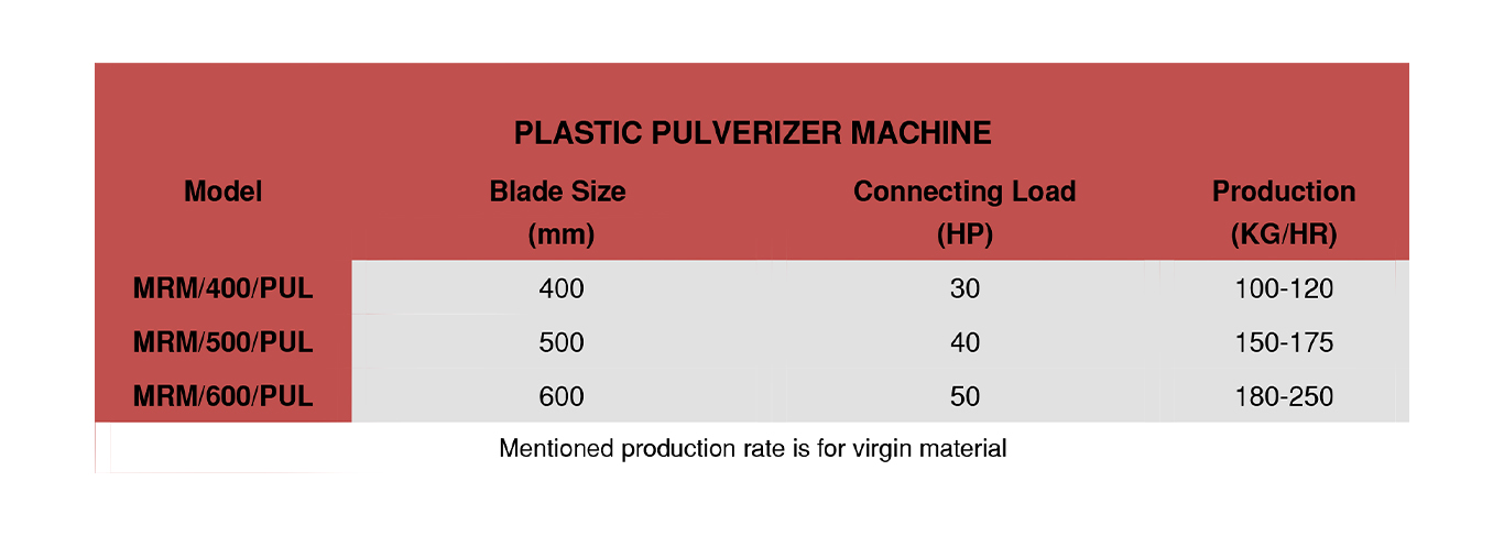 Our Plastic Pulverizer Models have Capacity of 50 kg/hr to 300 kg/hr.